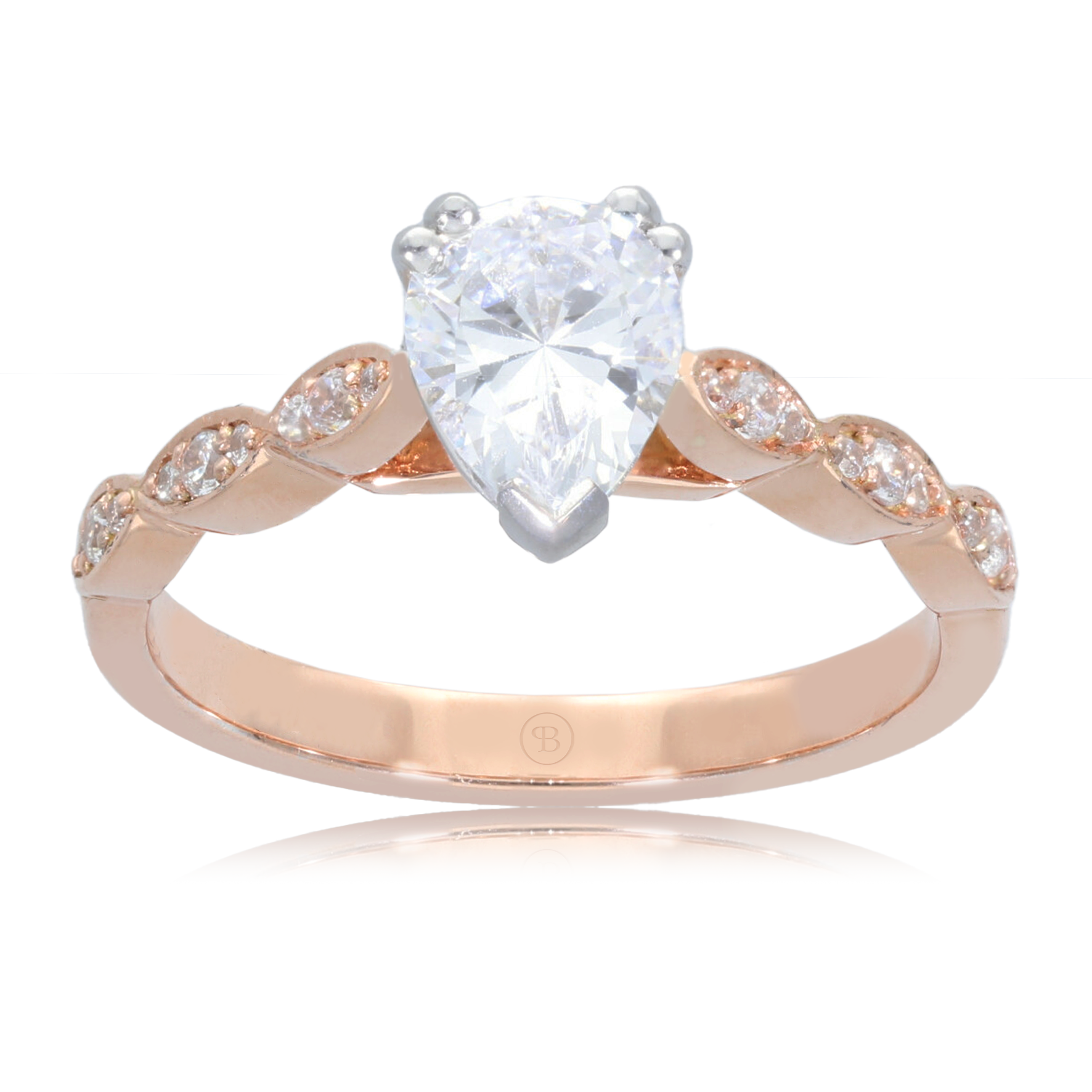 Refined elegance in every detail, this two tone 9ct gold engagement ring features a 1.0ct natural pear cut diamond as its centrepiece, admired for its graceful shape and radiant brilliance. The design is enhanced by 18 natural diamonds in HSI quality — 6 x 0.01ct and 12 x 0.005ct — each hand set to add sparkle and sophistication along the band.