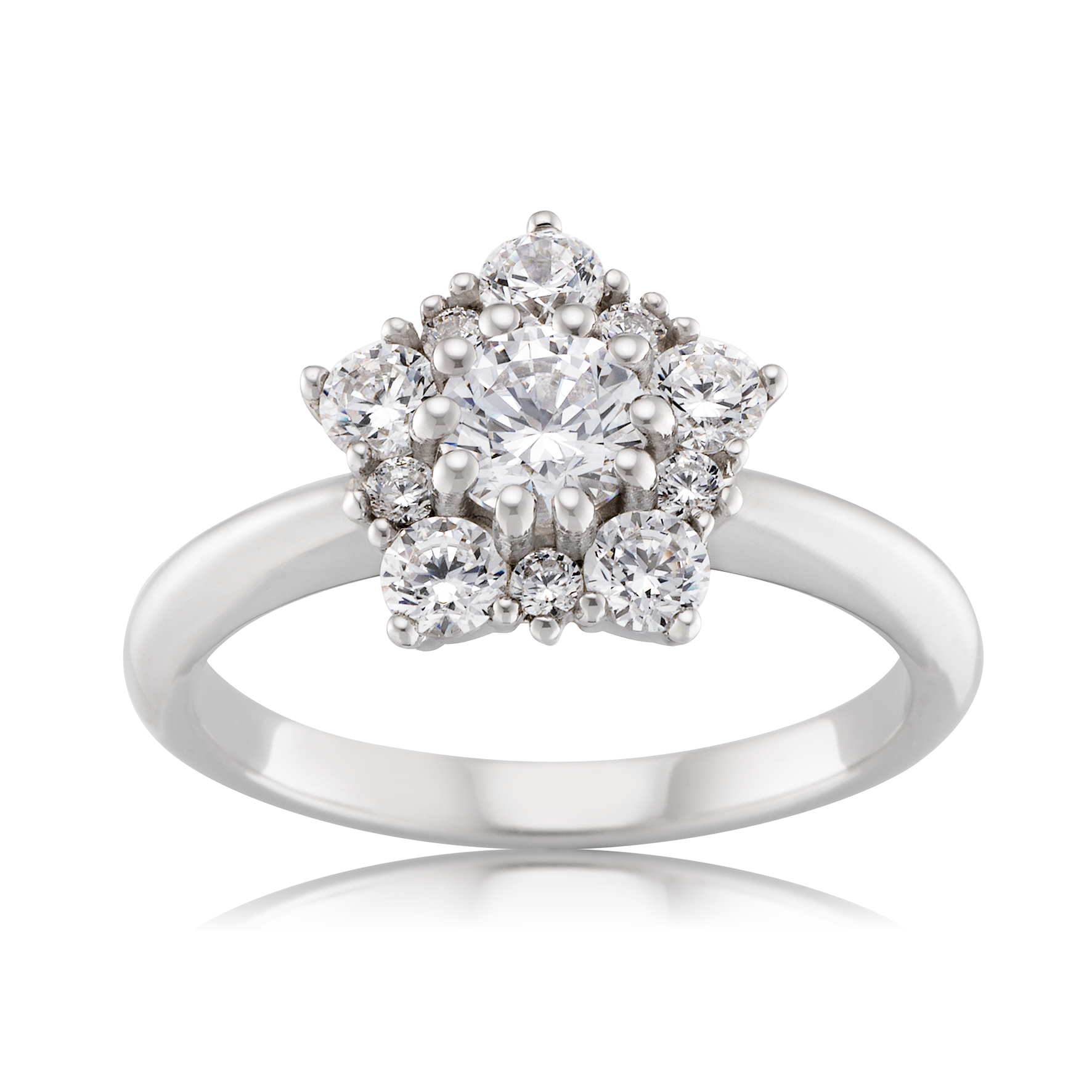 A ring that blends delicacy with striking presence, this 9ct white gold engagement ring showcases a 0.50ct natural round brilliant cut diamond at its centre, admired for its timeless sparkle.